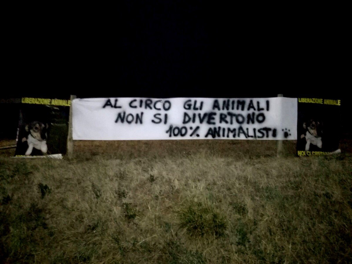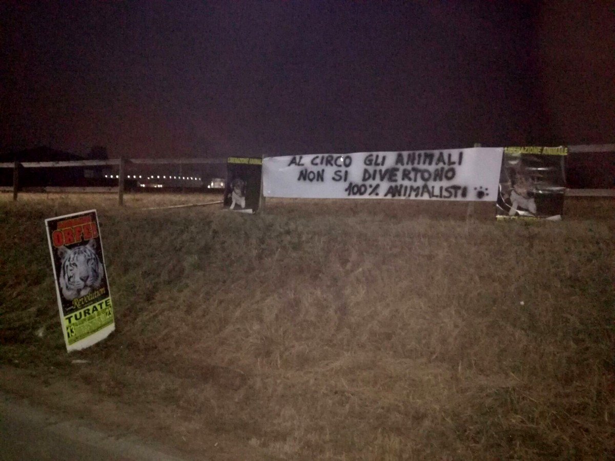 Nella notte tra il 9 e 10 gennaio, militanti di CENTOPERCENTOANIMALISTI hanno affisso manifesti di Liberazione Animale e uno striscione cristallino nell’area dove si attenderà il circo di Armando Orfei in via Garibaldi a Turate, al circo gli Animali non si divertono!