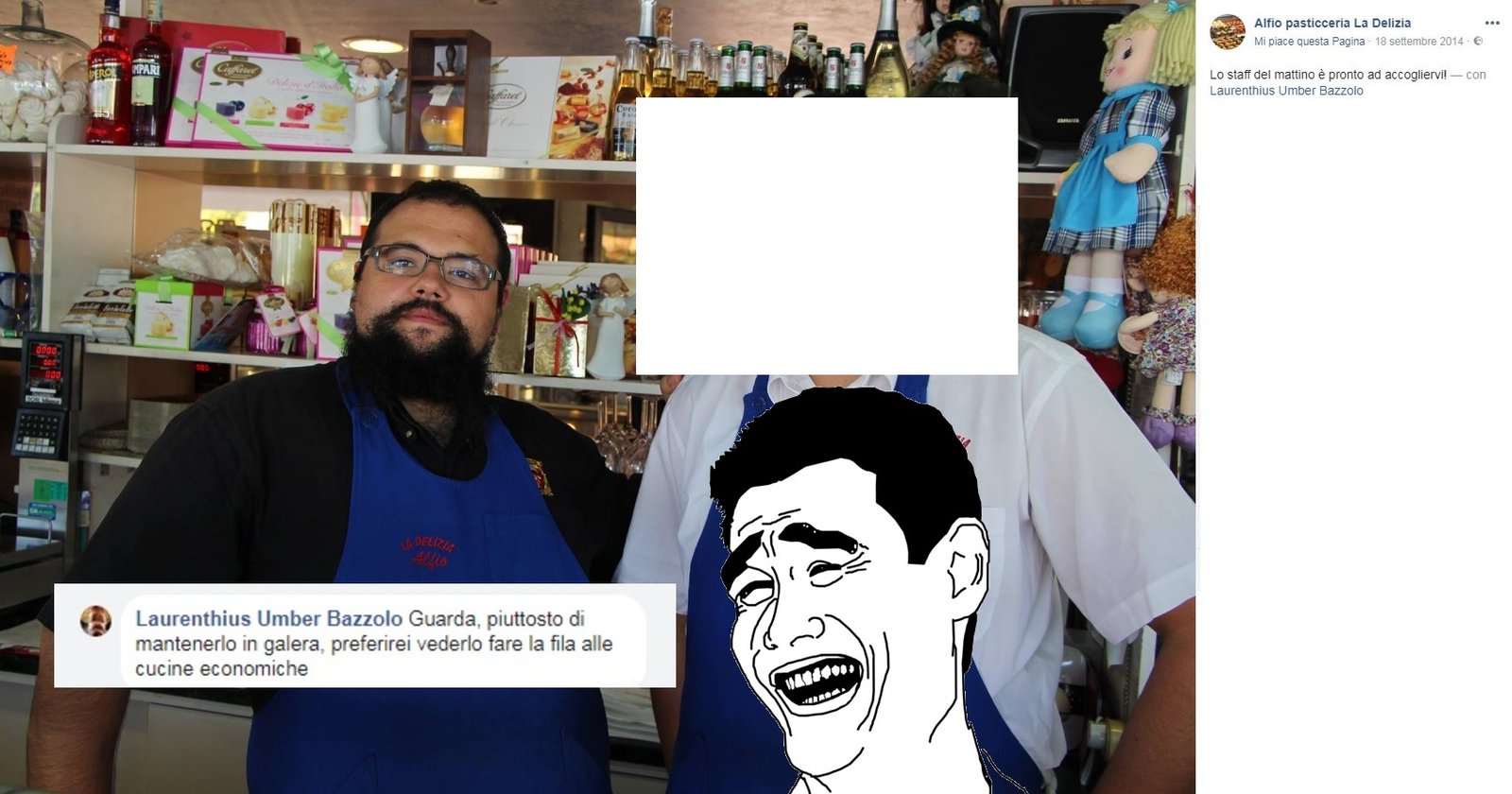 Questo invece è un pasticcere PADOVANO (che culo!) che ce l’ha a morte con TUTTI i Vegani, spesso si leggono i suoi deliri in rete. La foto è pubblica come è pubblico il nome della SUA pasticceria, ho nascosto il volto del suo collega per correttezza. Chissà se ci saranno brioche Vegane nel suo locale.
