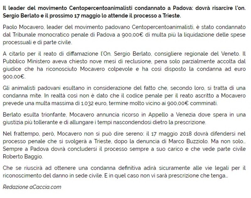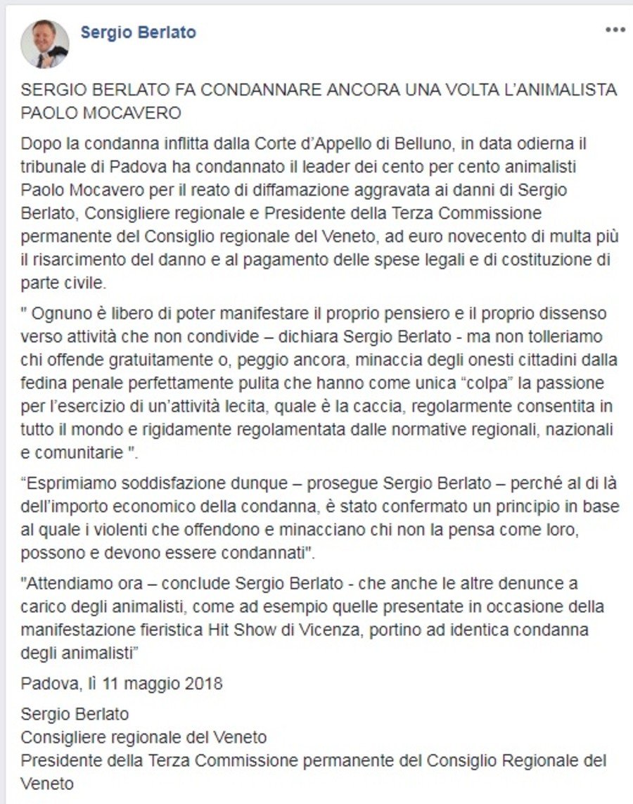 Il cacciatore e consigliere regionale Veneto sergio berlato ha spacciato la sentenza di Padova come una condanna degna dei detenuti del mitico carcere di Alcatraz Island. Questo il suo comunicato, arrivato con circa tre ore di ritardo rispetto a quello del Movimento che rappresento.