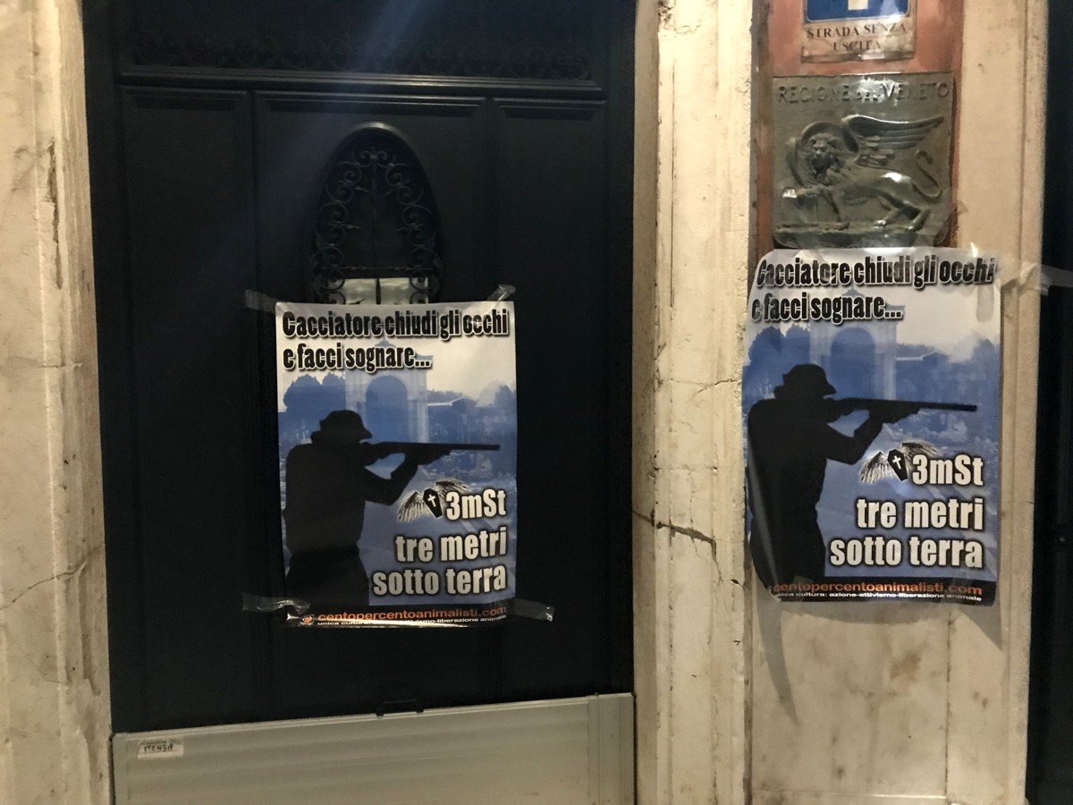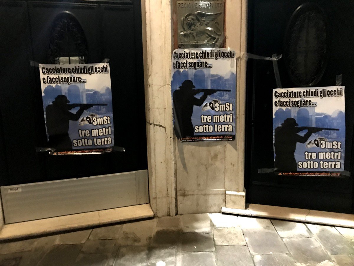 Nella notte tra il 6 e 7 novembre, i nostri Militanti si sono recati a palazzo Balbi a Venezia, sede della Regione Veneto, e per protestare hanno affisso sulle porte e muri di uno degli ingressi, manifesti di buon auspicio diretti ai cacciatori.