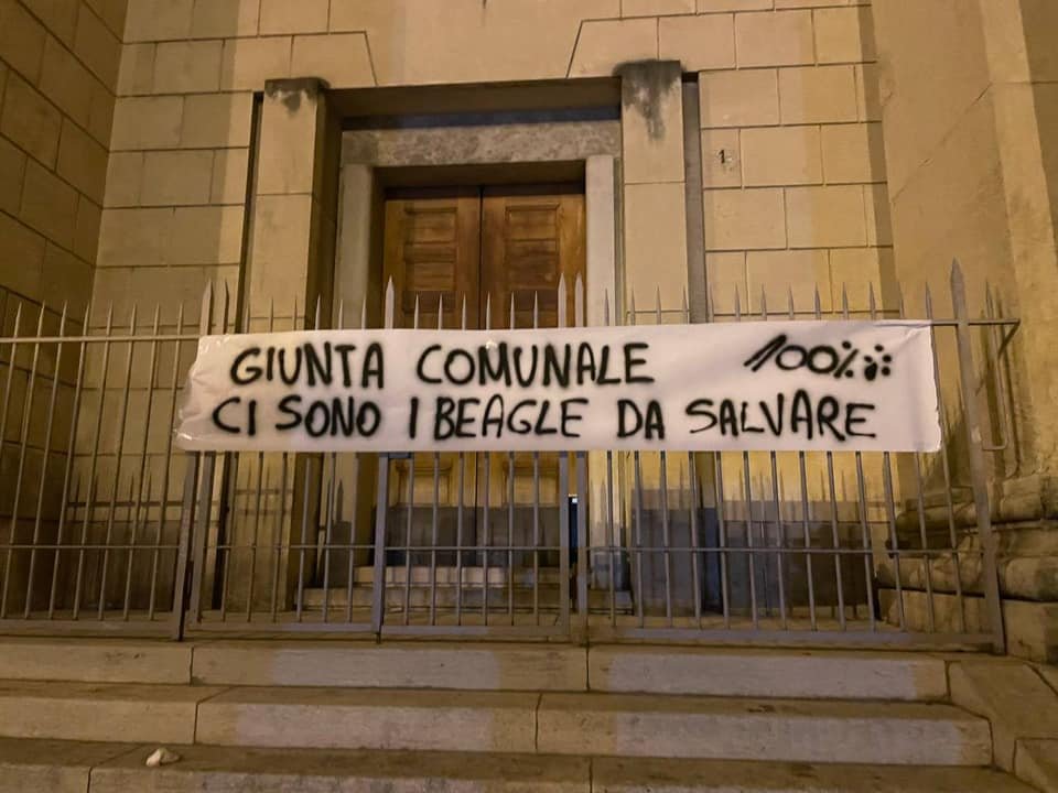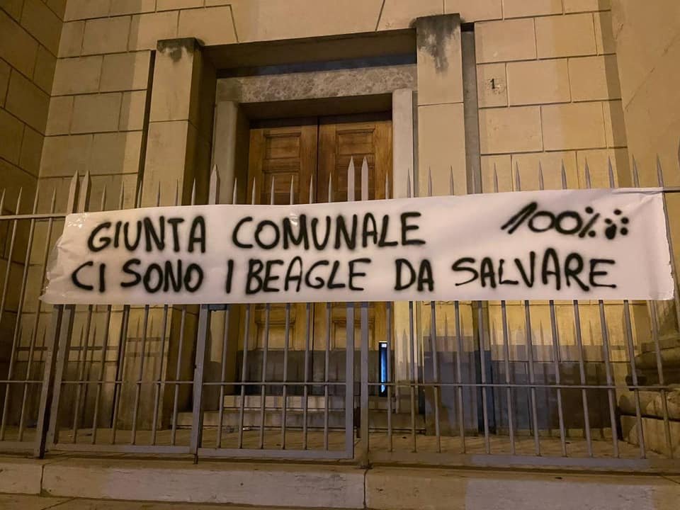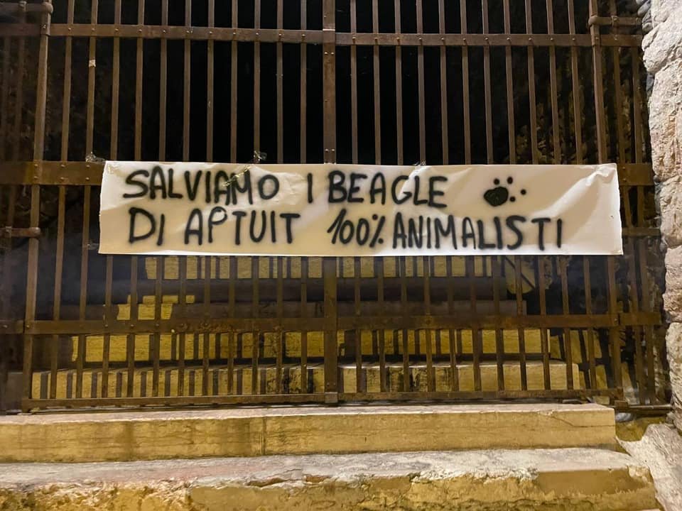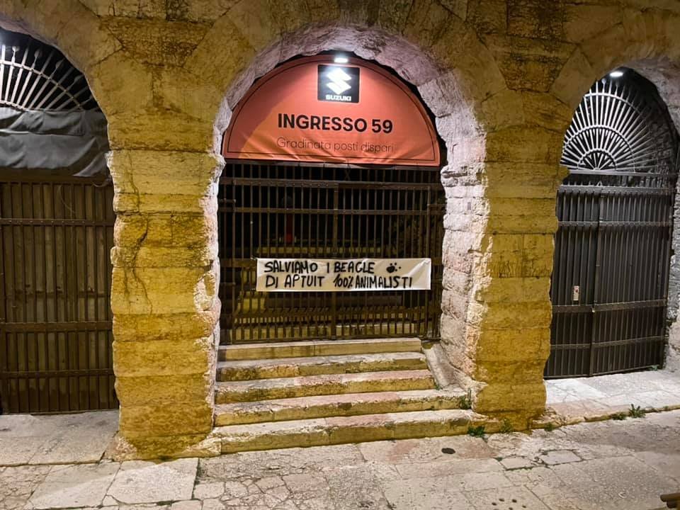 In vista dell’organizzazione di una manifestazione a Verona prevista domenica 26 settembre davanti all’Aptuit, dove sono detenuti, oltre ad altri Animali, 20 cuccioli di Beagle di appena quattro mesi destinati agli esperimenti più infami, militanti di CENTOPERCENTOANIMALISTI nella serata di lunedì 13 settembre, hanno tappezzato alcuni punti nevralgici della città con striscioni che chiedono la loro liberazione. Gli striscioni sono stati afflissi all’Arena, al Municipio, alle stazioni dei treni di Verona porta nova e Verona porta Vescovo.