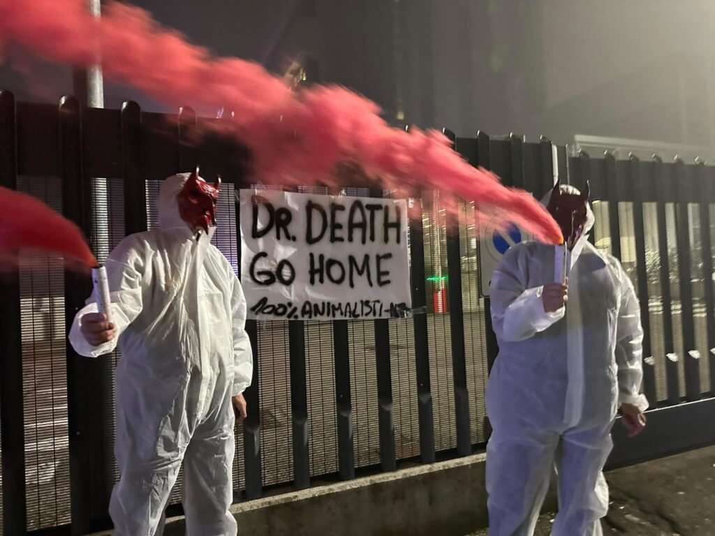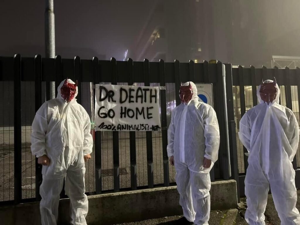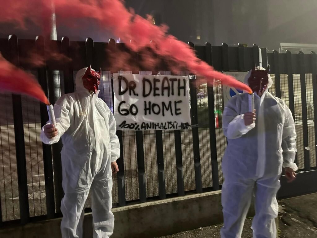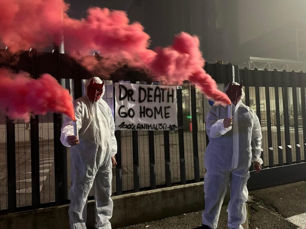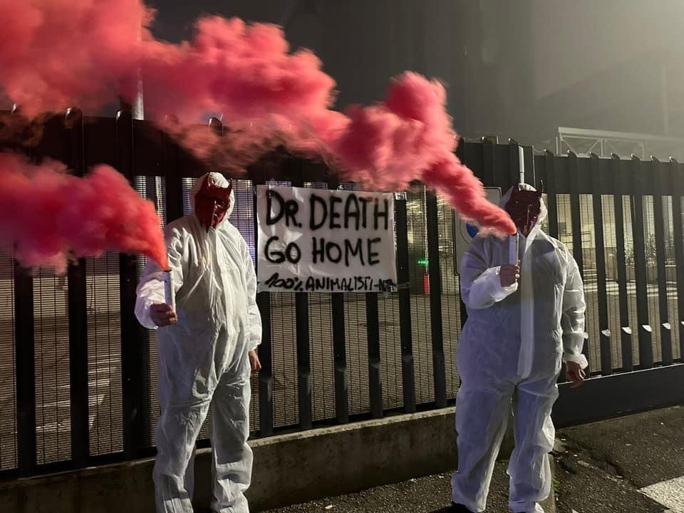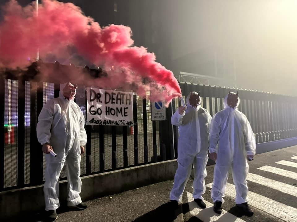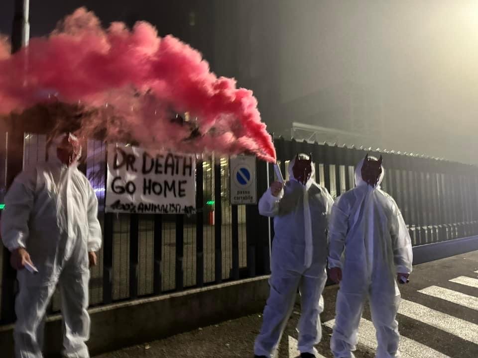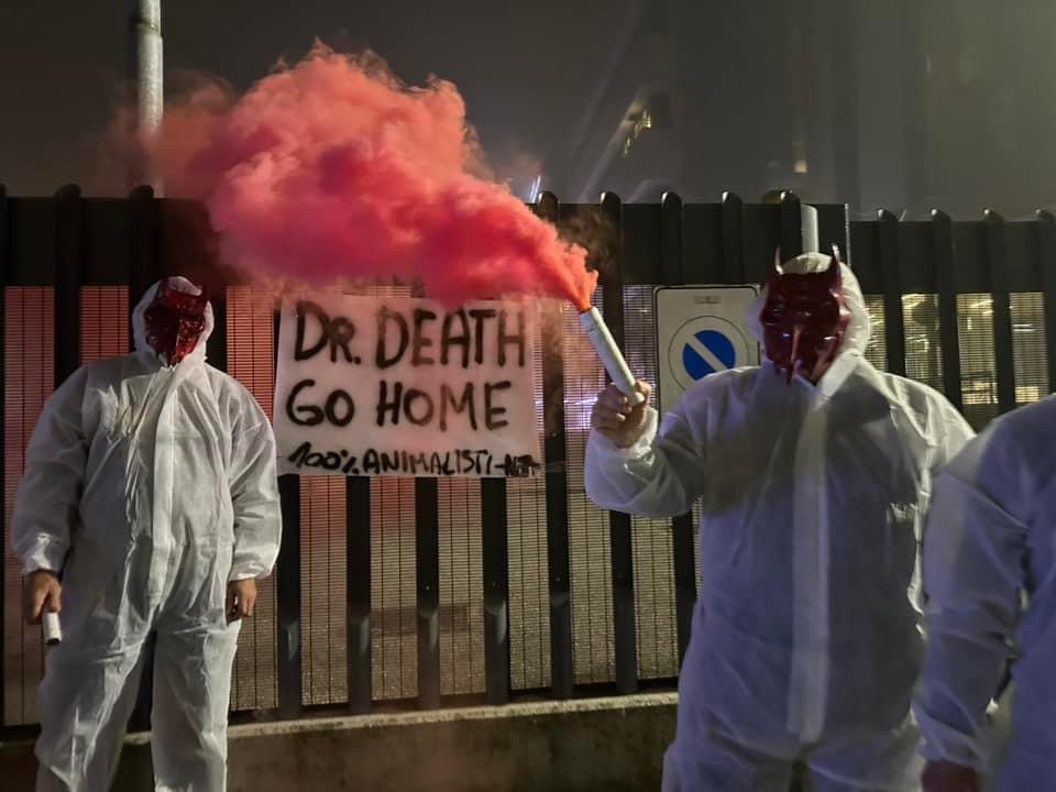 In tarda serata di lunedì 4 novembre, Militanti del Movimento CENTOPERCENTOANIMALISTI, hanno indossato tute da laboratorio, maschere da diavoli, e si sono posizionati davanti ai cancelli di Aptuit in via Fleming a Verona, affiggendo uno striscione e accendendo fumogeni rossi. Sullo striscione la scritta: “Dr. Death ho home”.