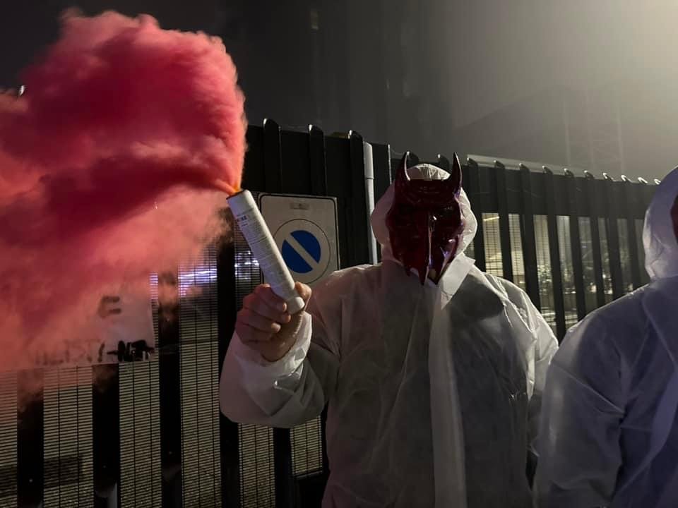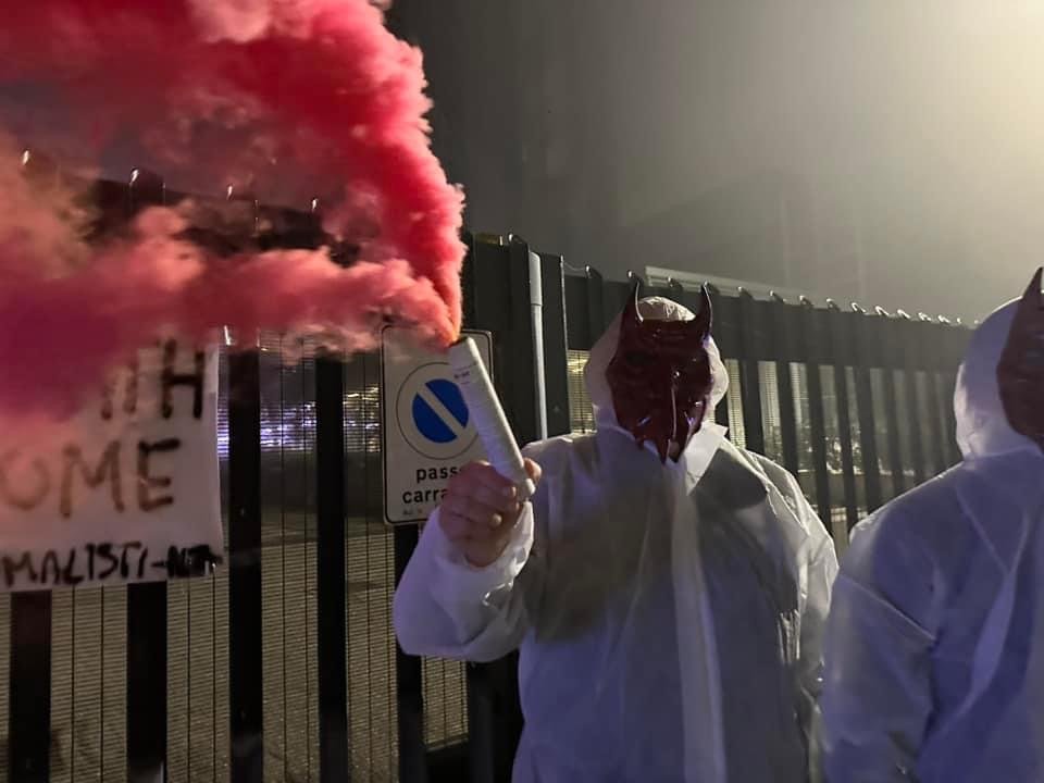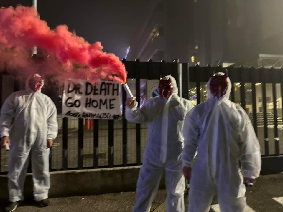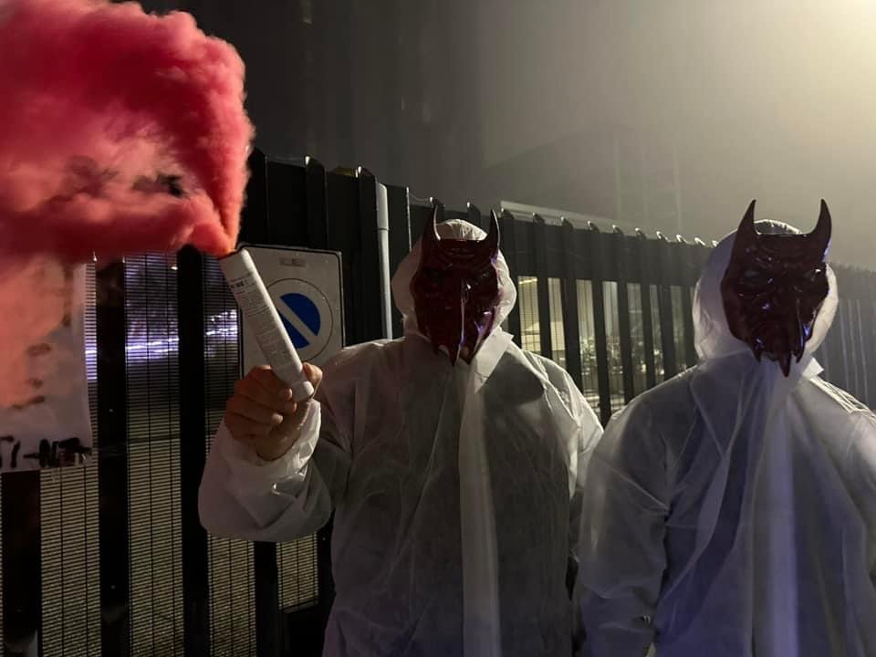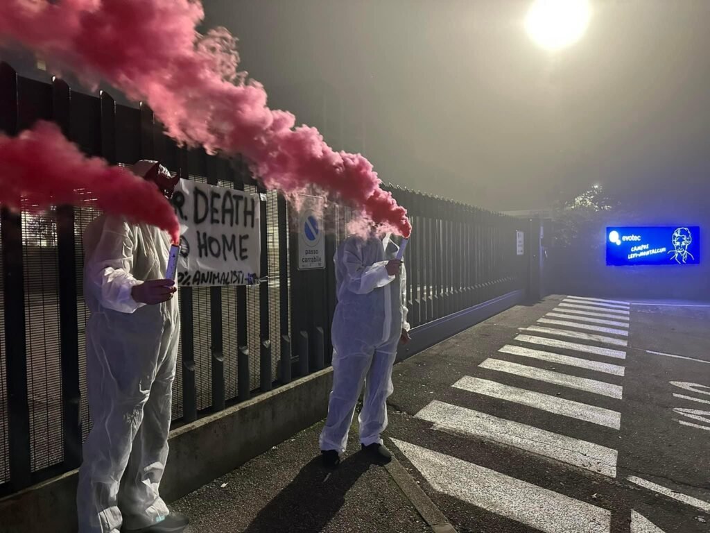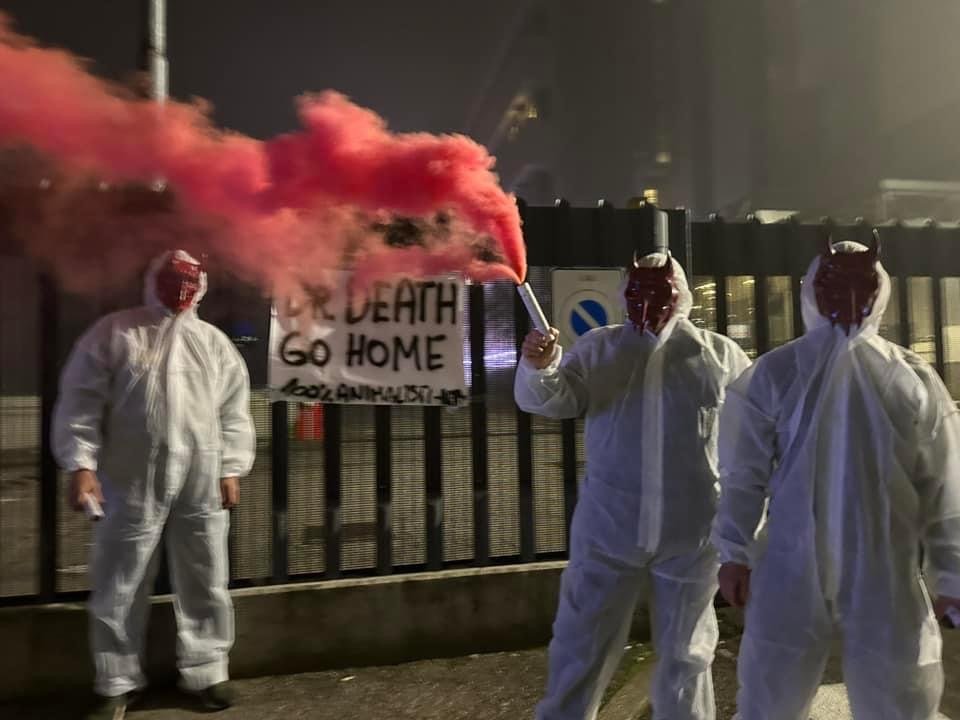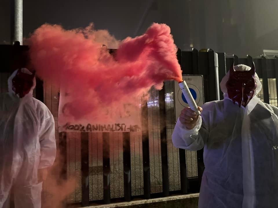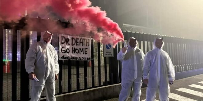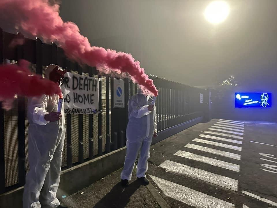 In tarda serata di lunedì 4 novembre, Militanti del Movimento CENTOPERCENTOANIMALISTI, hanno indossato tute da laboratorio, maschere da diavoli, e si sono posizionati davanti ai cancelli di Aptuit in via Fleming a Verona, affiggendo uno striscione e accendendo fumogeni rossi. Sullo striscione la scritta: “Dr. Death ho home”.